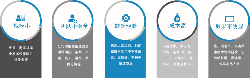 团队不健全 公司需独立组建微信运营团队,策划、文案、美工、运维、数据分析等。
