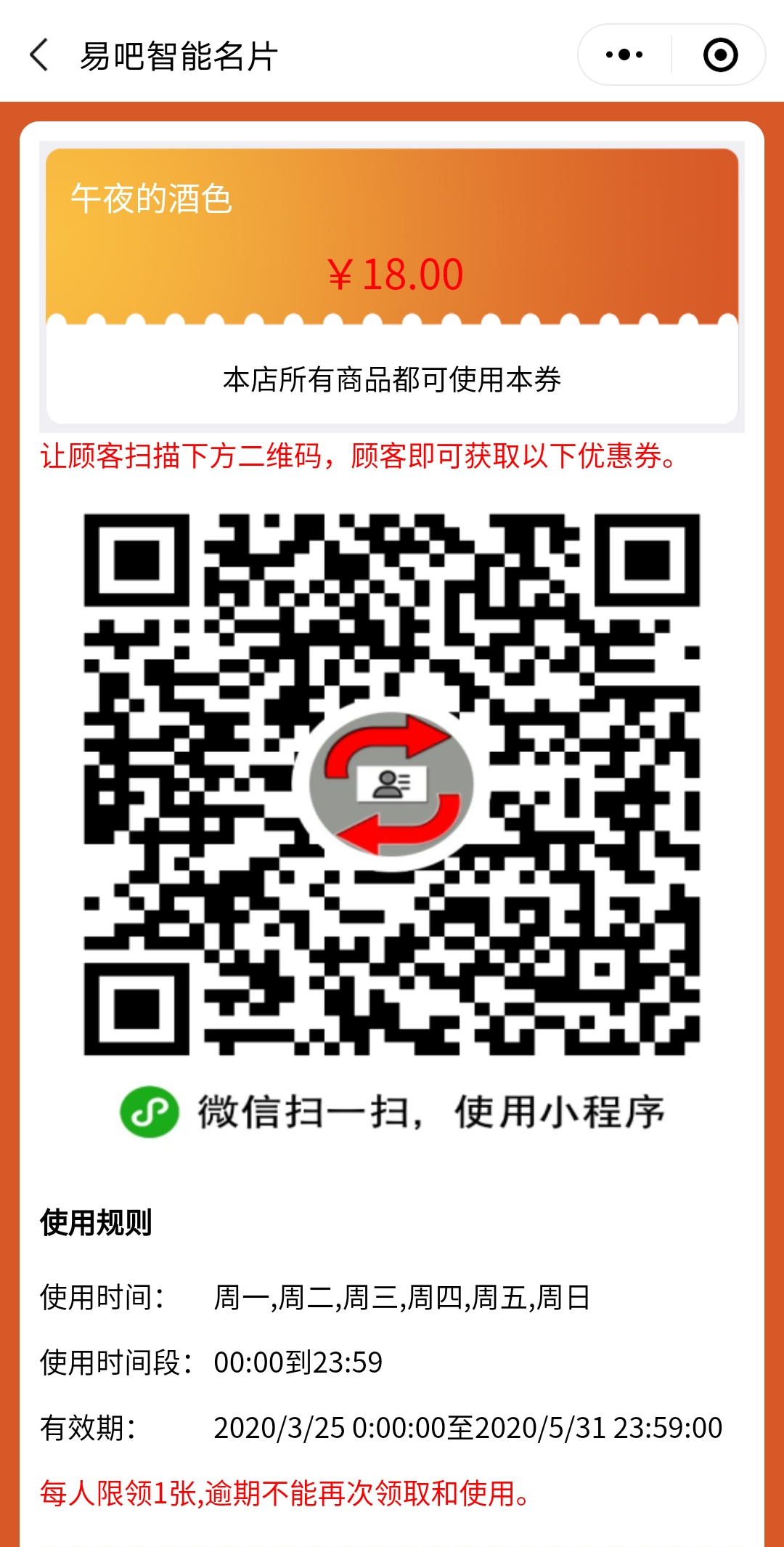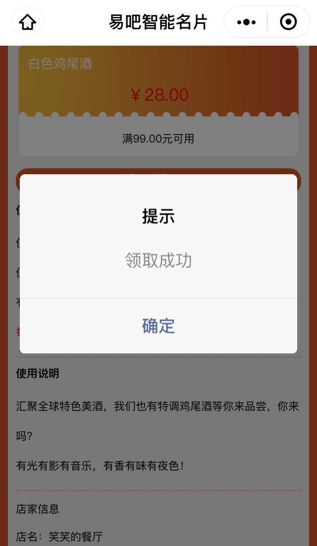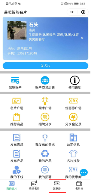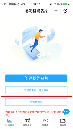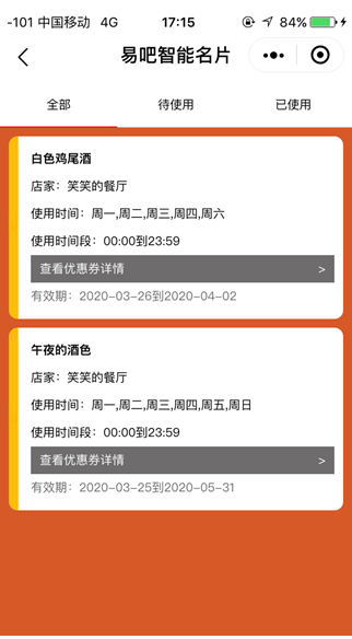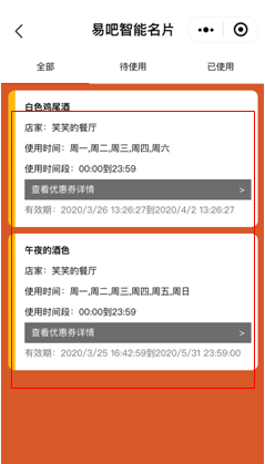 下次到店使用或者查看优惠券,可以在微信小程序中点开易吧智能名片,再点击我的优惠券就会出现还未使用的优惠券了。