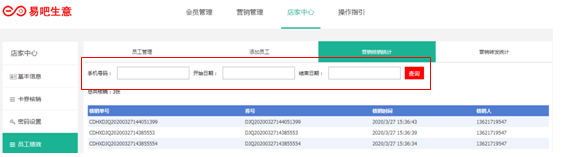 可以输入店员的手机单独的查看记录,作为绩效统计。