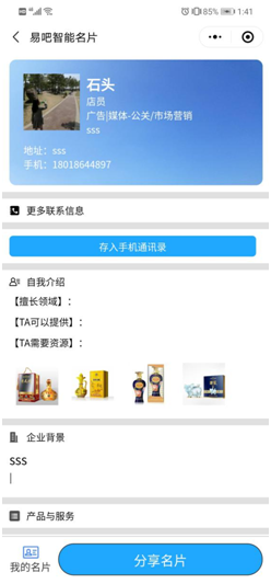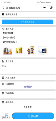 易吧智能名片,可以自由地在微信群、朋友圈中自由分享转发,能很好地利用微信平台来引流,实现裂变式的传播。易吧名片具有更加多元化的展示功能,销售人员无需再使用传统的纸质名片,智能名片在手,再进行销售时就占据更多的优势。
