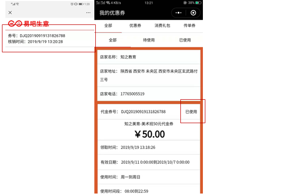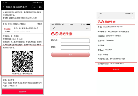 会员在使用中只需要卡券二维码就可以了,店员使用微信扫一扫对准活动券的二维码就会出现活动券内容,点击确认核销(需要登录一次店里的易吧生意账号和密码),核销后会出现核销记录,客人手机上的券也会显示已使用,这样就完成了券的使用了。