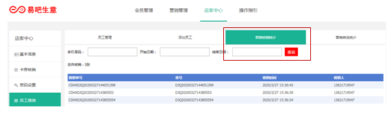 核销完成后也可以在后台查询是否核销准确,店家中心--员工绩效--营销核销统计,店员的个人核销数据在里面会全部显示。
