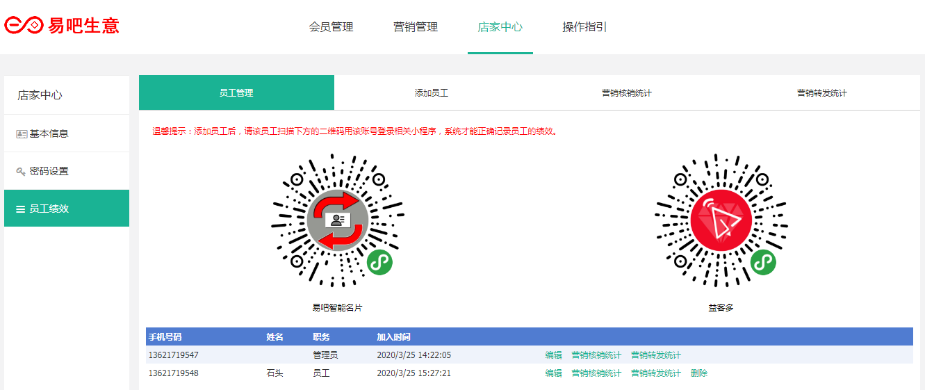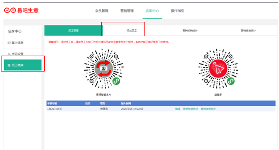 首先登陆易吧生意后台,在店家中心点击员工绩效,在点击添加员工,录入信息后点击确认。