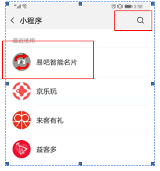 店员打开手机,在微信小程序查找内如入(易吧智能名片)就会出现我们要使用的小程序了。