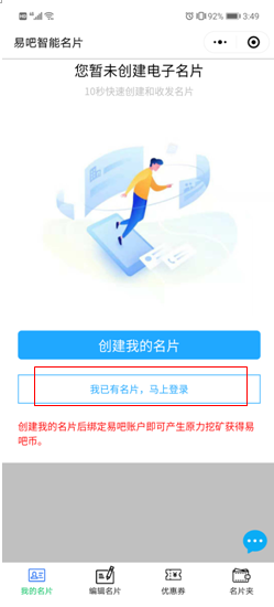 点击进入后,点击我已有名片,马上登录。